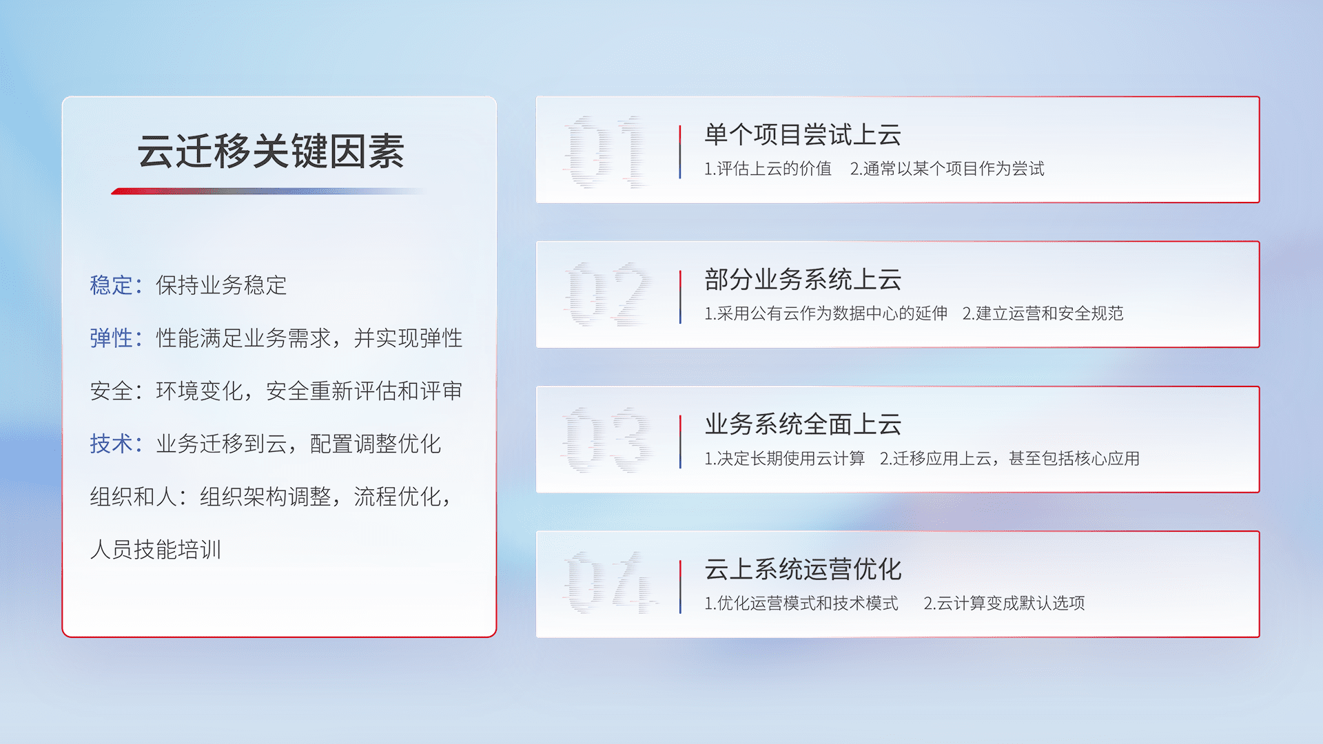 结合实际业务,,,从规划设计、、云平台选型、、、、云原生改造、、数据迁移、、、、集成交付,,迁移全过程为客户识别最佳上云路径,,,,做好风险识别管理,,,设计网络架构、、、身份权限、、、、安全审计合规、、、操作审计、、、、日志审计、、、、监控告警策略、、、多站点容灾设计等,,,对云上基础设施进行整体规划,,,提升IT治理水平,,,,以满足弹性、、、、高可用、、、高性能的需求。。