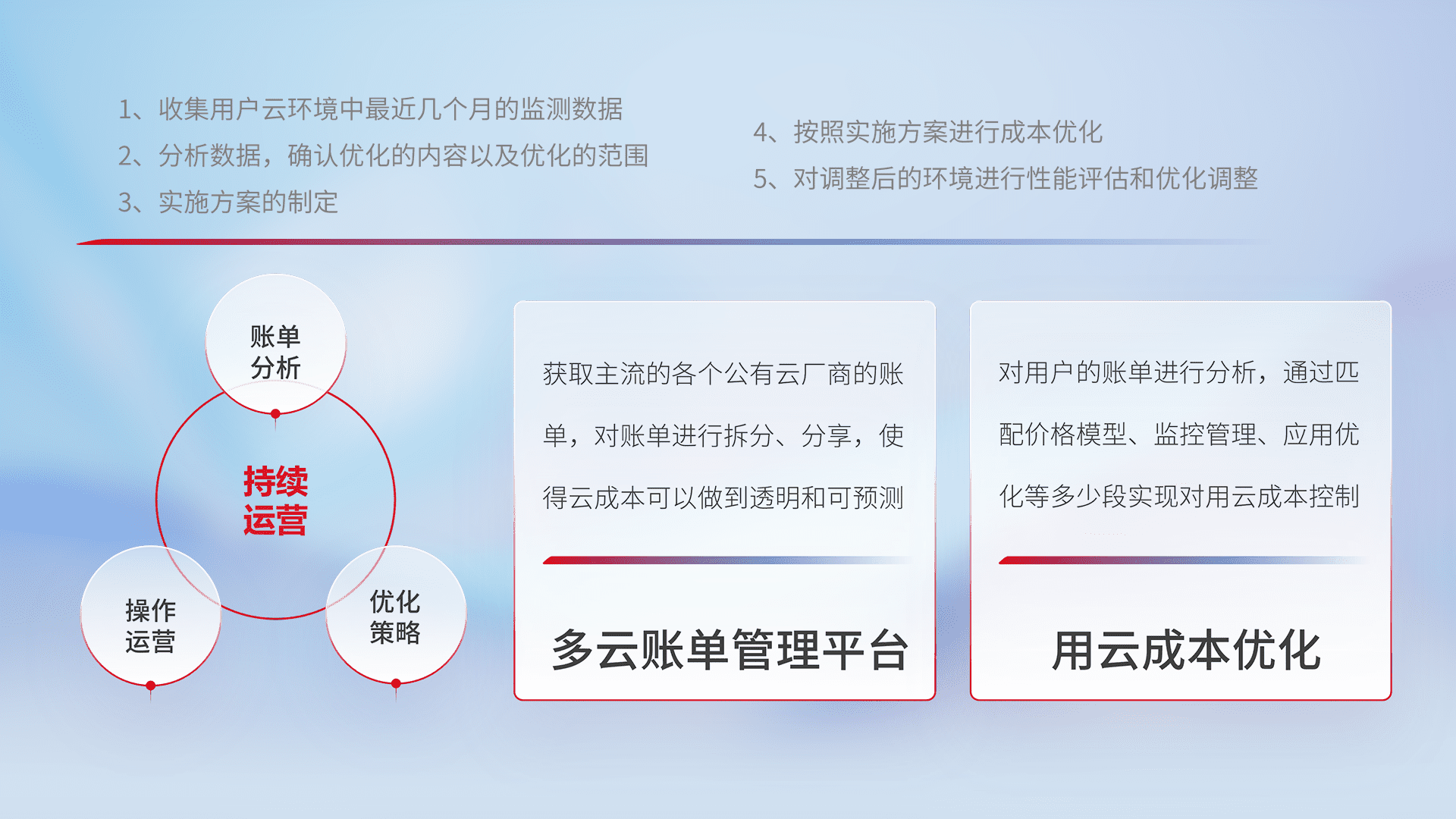 通过多云纳管,,以统一的资源数据模型把客户的云资源进行抽象和封装,,进而实现对多云资源的统一操作,,,,保障云资源管理的可靠性、、、稳定性与可用性。。。。量身定制化运维内容,,,,配置、、、、开发运维、、、、补丁管理、、、、备份、、、监控、、认证和访问管理、、审计和日常巡检等,,,保障在用云过程中的可靠度,,稳定度以及高可用率。。。